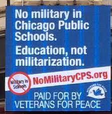 The Chicago Chapter of Veterans For Peace recently met with the heads of Chicago JROTC.  We both agreed that youth need critical thinking skills.  We suggested that they invite us to speak at the eight military schools and at all of the JROTC and Cadet classes.  They’re thinking about it.   We also asked the Chicago Public School Board to join us in a roundtable discussion of the militarization of youth.  They haven’t responded.
